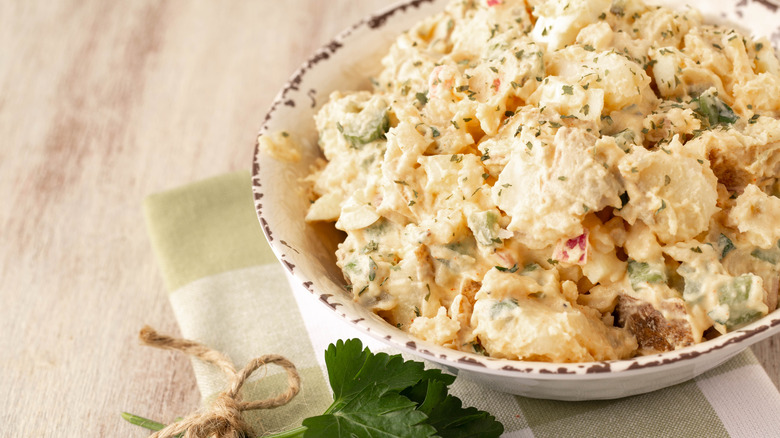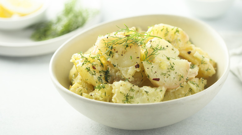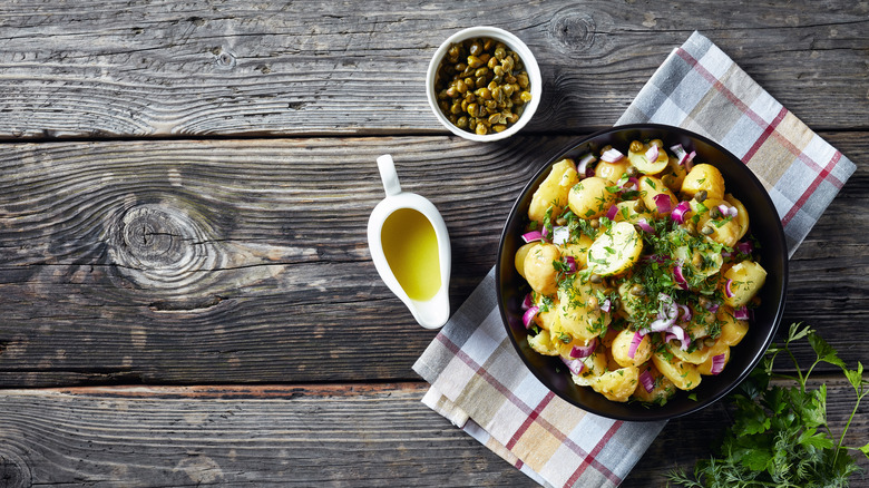 Potatoes are universally loved, whether they're baked, fried, or boiled. When it comes to potato salad, everyone seems to think that their "famous" recipe is best, but the truth is that there are so many ways to add variety to the dish that you should never make it the same way twice. Whether you're using a creamy mayonnaise base potato, bringing some tang by using an oil-based vinaigrette, going heavy with the addition of bacon fat, or keeping things light with a sprinkle of fresh herbs, the options are endless.
