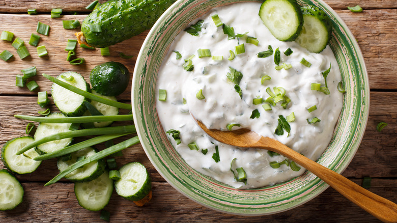 While we've talked quite a bit about Mediterranean variants, we have yet to mention the addition of a popular, creamy, zingy, yogurt-based sauce to elevate your potato salad. Tzatziki has all the classic elements of a potato salad dressing: the acidic element, fresh herbs, a creamy component, and even a bit of crunch.
