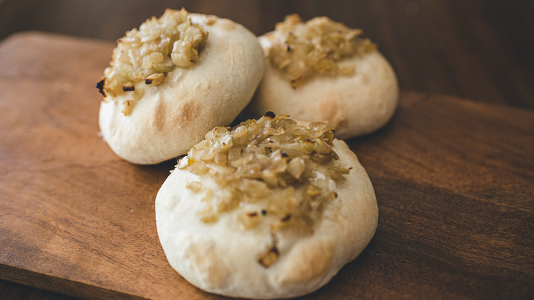 As mentioned above, bialys almost look like the bagel's twin. But what appears to be a hole in the middle of a bialy is actually just an indentation. Depending on the baker, the indentation is as small as a thumbprint or quite a bit larger, but it does not go all the way through the dough. The dent is filled with flavorings like minced onions, garlic, and poppy seeds, per What's Cooking America, and the dough noticeably lacks the characteristic sheen that is so characteristic of bagels. This is because bagels are boiled before they are baked, and bialys are not. The website explains that bialys came to New York from Bialystok, Poland and, while still popular within the city's Jewish community, the once impressive number of bialy bakeries in New York has dwindled down to a mere handful. Mental Floss goes on to say that finding fresh bialys outside of New York is difficult.