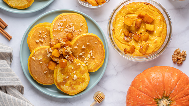 We love adding pumpkin puree to our pancake recipes. On its own, pumpkin puree isn't sweet or particularly flavorful, but it is moist. You can pair pumpkin with numerous other ingredients and pancake toppings like pecans, walnuts, chocolate chips, or warming spices like cinnamon and cloves. Regardless of how you pair the pumpkin, you should add it to your batter with the rest of your wet ingredients. Since the pumpkin puree is denser compared to the heavy cream or melted butter in your recipe, you should be prepared for your pancakes to come out a bit chewier than recipes that don't use this ingredient.