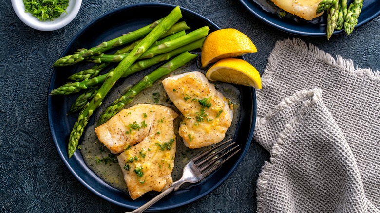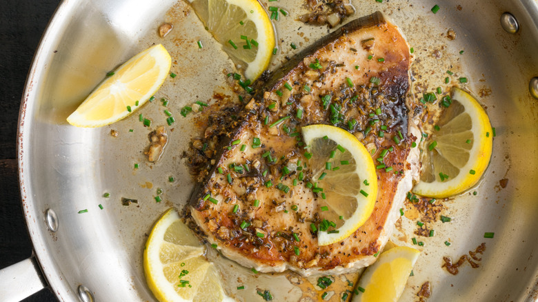 Chicken breasts may get a lot of the attention, but when it comes to a quick and easy meal that's both healthy and delicious, pan-fried fish can't be beat. Tender and flaky with enough flavor that it only needs a little salt and lemon, a good piece of fish can go from fridge to plate in 10 minutes or less. It's also healthy, with the Washington State Department of Health noting fish is a low-fat protein that is rich in vitamins and minerals like iron, zinc, iodine, and potassium. It's the perfect thing to plan for a busy weeknight, or keep in the fridge to be tossed on the stovetop when the need or craving strikes.