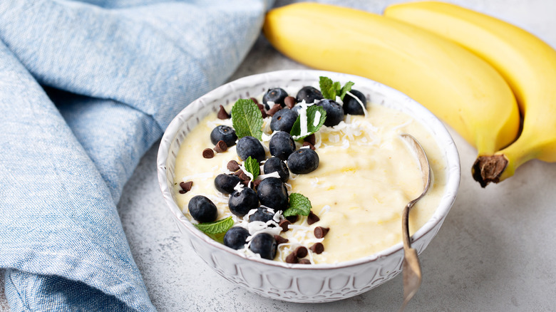 To make nice cream, all you have to do is slice or break up some ripe bananas, freeze them at minimum overnight, and toss them into the jar of a food processor or blender (preferably a high-speed type, such as a Vitamix). You'll pulse the mixture until the bananas break up, pausing to scrape down the bowl, then run the machine for a good five minutes or so, according to MasterClass, until the mixture is smooth and thick like soft serve ice cream. At that point, you can leave the dessert as-is, or pulse in mix-ins of choice such as toasted nuts, chocolate chips, coconut flakes, or anything else that strikes your fancy.