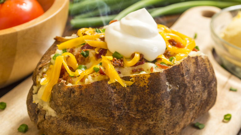 Cheese is an essential addition to almost every dish ever. There are very few foods that don't taste even better when they're sprinkled with a generous serving of mozzarella or cheddar. So, it should come as no surprise that baked potatoes aren't an exception. You can choose to incorporate cheese in a few different ways. Our favorite involves immediately adding the shreds to the baked potato right after it comes out of the oven. This results in gooey, melted cheese that mixes in with the potato perfectly. You can also sprinkle some onto the top of the baked potato after you've already added all of your other toppings, but it might not melt quite as much if you take this route.