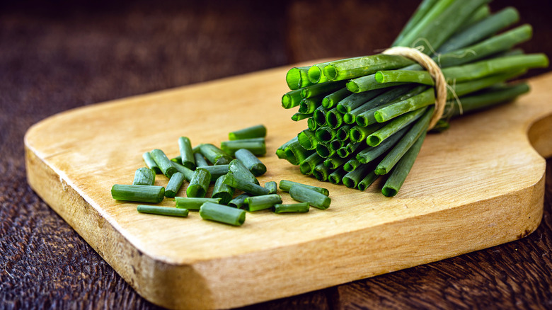 Behold the greatest baked potato topping of all time: the humble chive. This onion cousin has a similar flavor profile to scallions, but they're not quite as intense, and they're considerably smaller. This means that you can chop them really finely and mix them in with the potato well, ensuring that every bite offers a bit of the freshness and punch a good chive offers. Fresh chives are truly a delicacy to be treasured, and they're at their best when they're served on top of a steaming hot baked potato.