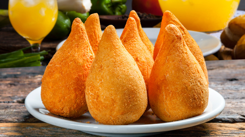 Served in the shape of a chicken drumstick, coxinha is a popular Brazilian fried snack enjoyed at parties, weddings, and buffets (via Vida Boa Acai). While some claim the dish has French roots, and that may be so, legend has it that the dish was created to appease a young prince. The story says Prince Antonio, son of Isabel, Princess Imperial of Brazil, loved to eat chicken drumsticks, but one day, the cook ran out. To please the little prince, the cook transformed a whole chicken into the shape of a drumstick made of dough and chicken pieces, creating the beloved snack (via Nobility). The prince approved of the snack and it became so famous that upon visiting, Empress Teresa Cristina sampled the dish and brought the recipe to the Imperial Court, where it then spread across the country.