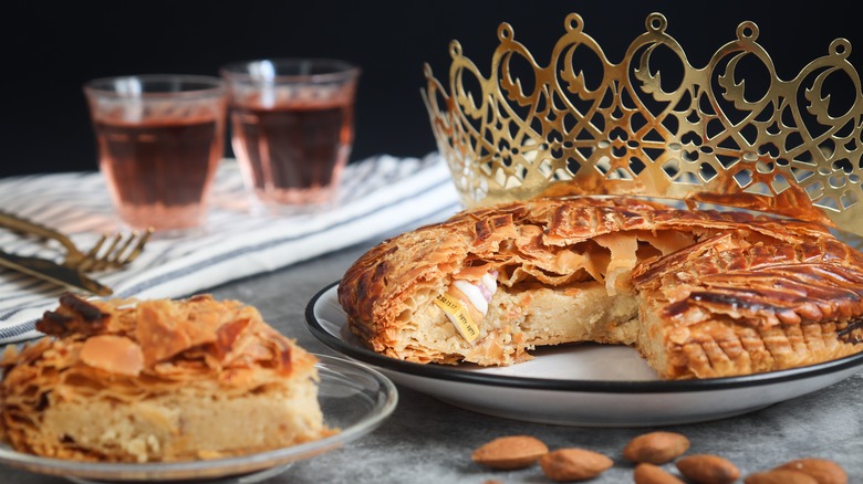 Frangipane, or frangipani, is a traditional addition to classic pastries and cakes such as the Bakewell tart. The sweet, almond-flavored custard is made by combining two parts of almond cream with one part pastry cream and is used in a variety of ways in the pastry arts. On Epiphany in France, the holiday is celebrated with a king cake, known as galette de rois, a round, frangipane-filled pastry decorated with a crown and sometimes stars or flowers with a special bean hidden inside. Whoever finds the bean is crowned king or queen for the year (via My Parisian Kitchen).