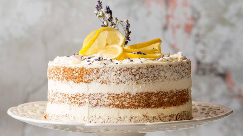 Similar to a naked cake, a semi-naked cake has frosting spread between each layer of cake. What sets it apart, however, is that a very light coat of frosting is used on the outside of the entire cake (via Quality Cake Company). This layer of frosting allows the layers of cake to still show through, but the extra, thin crumb coating might have a thicker, opaque spot or two, depending on the desired look.