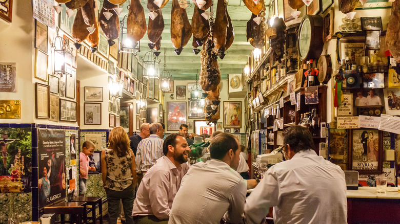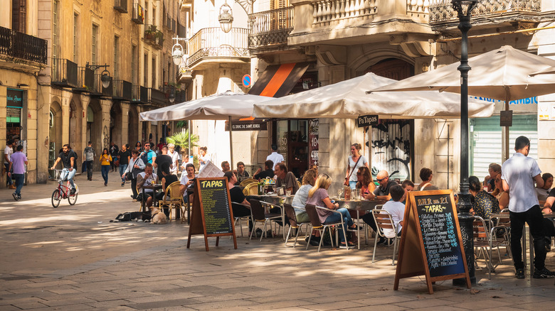 In Spain, however, you are limiting your experience by staying in one location. Spanish cities have distinct streets that are famously lined with rows of tapas bars, like Calle Navas in Granada (via Condé Nast Traveller). You can easily visit several bars in one evening by just walking down the street. Simply choose a bar, order a round of drinks and tapas, pay your bill, and move on to the next place. Trafalgar Tours claims this will have you dining like the locals. Another benefit is that if you aren't impressed by the first bar you chose, there are dozens more along the street to try.