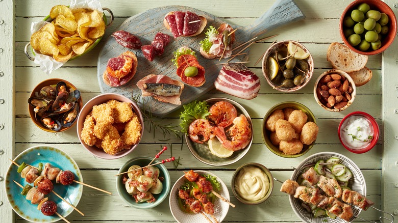 While tapas restaurants are a relatively new phenomenon in the U.S., this dining style has been in practice in Spain for ages. Numerous sources claim that tapas can be traced back to 13th-century King Alfonso X, whose health issues required him to drink copious amounts of wine. He would eat small portions of food between meals to lessen the effect of the alcohol. According to the legend, when he recovered from his illness, he decreed that everyone should have a bit of food with alcohol (via The Culture Trip).