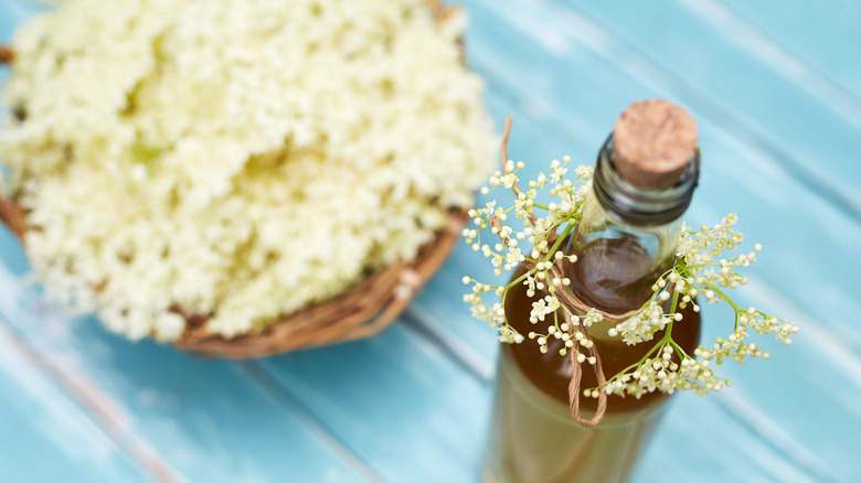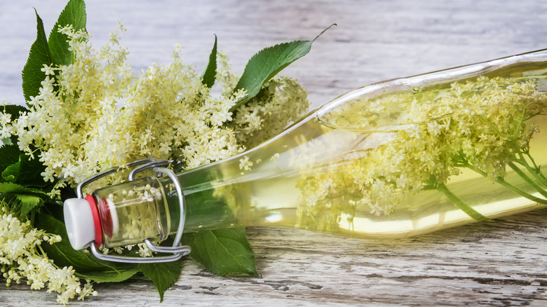 To make your own batch of elderflower liqueur, you'll need fresh elderflowers that have ideally been plucked from a clean environment (as per BBC Good Food). According to the Alcohol Professor, some brands make elderflower liqueur using elderflower extract, while others use herbal infusions to produce the drink. Some labels, like St-Germain, use the flower itself, specifically flowers that have been picked at the end of the spring season.