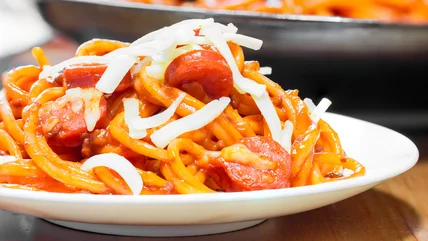 The first step, of course, starts off like any other pasta dish. Cook the noodles until al dente, and set them aside. Then, as per Pinch of Yum's recipe, the aromatics (onions and garlic) are sautéed until fragrant, and the ground pork is browned. Minced veggies (red peppers and carrots) and hot dogs are then added to the pan, and everything is simmered in water until cooked. The tomato sauce and ketchup products can then be added and simmered. Finally, the sauce should be ready. Kawaling Pinoy says that if you can't get your hands on banana ketchup, add sugar to regular ketchup for a workable substitute.