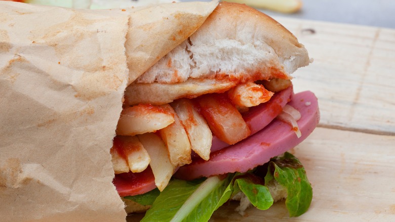 The Gatsby, explains Saveur, was created by Cape Town fish-and-chips shop owner Rashaad Pandy in 1976 when he was faced with a shortage of his signature fish but needed to quickly feed several laborers he'd hired. On hand, he had Portuguese bread, bologna (which he fried), piquant achaar, and chips, aka French fries. The filling and flavorful combination was an instant hit with the workers, who named the sandwich after the 1974 film "The Great Gatsby" (via IMDB.)