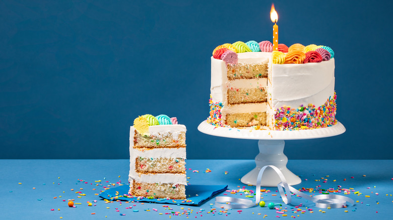 To get the knife to cut through your cake without any icing or cake coming up with it, Kitchn says you need to heat the knife up. They specifically recommend using a hot knife rubbed with a damp towel — the slightly wet blade keeps the knife clean, while the heat allows it to cut through swifter and cleaner without disrupting the cake and icing.