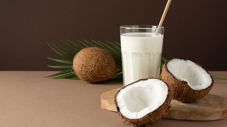 Nowadays, dairy allergies and lactose intolerances won't leave you sitting on the sidelines when it comes to enjoying a yummy dessert. Plant-based milk can be used as a substitute for dairy milk in countless recipes, and in many cases, you'd be hard-pressed to tell the difference. One such dairy alternative is coconut milk, which Eater explains is essentially the liquid squeezed out from the white, fleshy part of the interior of a coconut. Not to be confused with coconut water, a clear liquid also contained within the fruit, coconut milk is white and fatty. You can find it sold in cans or cartons and should ideally look for a brand that doesn't include added sugars or stabilizers in the ingredients list.