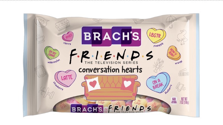 Fans of the beloved show, "Friends," likely remember the episode, "The One with the Candy Hearts." Who could forget the dateless girls' cleansing ritual, Chandler's blind date with his ex-girlfriend, Janice, or how Ross snubs his V-day date to make conversation with his ex-wife, Carol (via IMDB)? And this year, Valentine's Day is going to be extra cute and ironic as Brach's is going all in on the Friend universe. According to a press release received by Tasting Table, the candy company synonymous with the adorable hearts is launching limited edition Friends conversation hearts that will feature some of your favorite lines and a few new flavors too.
