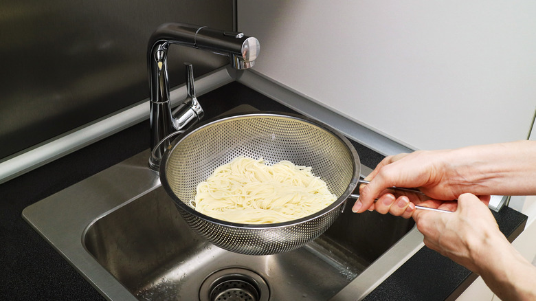 Many people swear by rinsing pasta after draining it, while others won't hear of it. The problem with rinsing is that it removes the starch which helps the dressing stick to the pasta. That's especially a problem for cold pasta salad, which needs the dressing to evenly coat each noodle instead of dripping to the bottom of the serving dish.