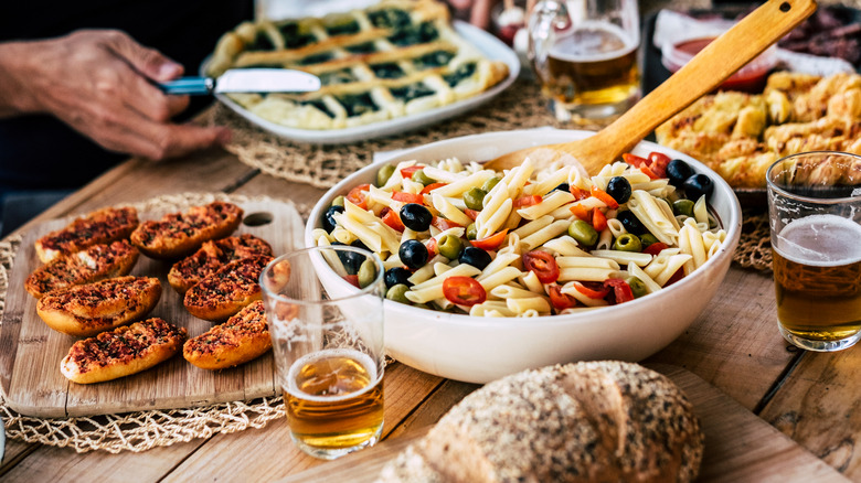 Pasta salad is a long-standing favorite gracing picnics and potlucks across the country. Despite pasta's Italian origins, pasta salad is decidedly American, because Italians don't eat cold pasta or serve it as a side dish. It's speculated that in the early 1900s, Americans combined the pasta brought over by Italian immigrants with elements from the potato salads dressed in mayo that came to the U.S. courtesy of German immigrants (via Dagostino). Today, a summer barbecue wouldn't be complete without it.