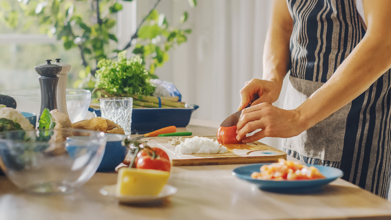 The proportion of pasta to mix-ins will affect the overall dish's harmony as well. Chop ingredients to a size that complements your chosen pasta shape. Spare your guests the misery of trying to scoop up a plateful of tiny veggie pieces after the pasta is gone. The goal is to pick up a little of everything with your fork, so chop veggies about the same size as the noodles or a little smaller.
