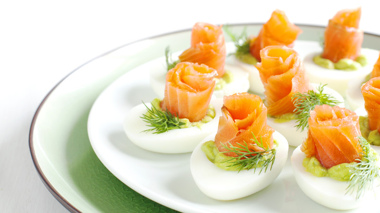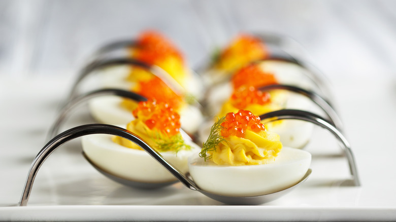 Lend some sophistication to the classic dish with a garnish of caviar. This fancy ingredient on deviled eggs is a simple way to add a touch of decadence to an otherwise basic appetizer. The highest quality caviar (unfertilized fish eggs) comes from the areas surrounding the Caspian Sea, harvested from female sturgeon that spawn once every several years (via Masterclass). Each package is the result of an intensive harvesting process that requires catching the fish at the right time and carefully extracting, then washing, and preparing the eggs by hand.