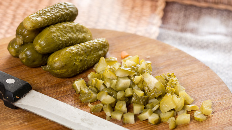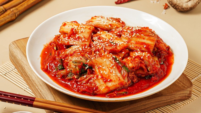 Much like pickles, fermented foods like kimchi or sauerkraut are an excellent way to balance and brighten rich, fatty dishes. However, unlike pickled foods, the acid in kimchi and other fermented dishes does not come from vinegar. These foods get their sour taste from natural bacteria, known as probiotics, that convert the sugars and carbohydrates into acid which helps to preserve the food (via Asia Society). Thanks to their acid content, pickled and fermented foods are a welcome addition to deviled eggs.