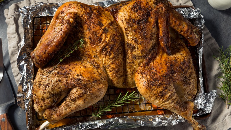 Thanksgiving is one of the most stressful holidays for home cooks. But with Martha Stewart's hack for a quicker cooking turkey, you can enjoy a more relaxing holiday cooking experience. Her go-to cooking method for turkey is spatchcocking. Spatchcocking removes the turkey's backbone, meaning that the bird can lie flat on the rack and roast quicker than a whole-bird method. Spatchcocked turkey can be seasoned with a variety of spices including thyme, oregano, and rosemary.