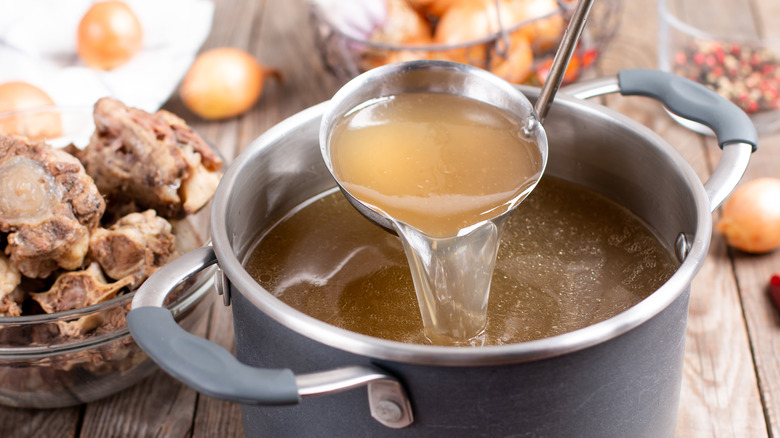 Anyone who has made a French onion soup knows the importance of hearty beef stock. This vital kitchen ingredient is made by simmering beef bones, aromatic spices, and a mirepoix for several hours to allow the bones to release collagen and thicken. Martha Stewart's recipe for beef stock, as shared on her YouTube channel, involves roasting oxtail and veal bones for 45 minutes before adding veggies and cooking for another 40 minutes. After the ingredients have been roasted, Stewart recommends adding everything to a stockpot, deglazing the roasting pan with red wine before adding it back into the stockpot.