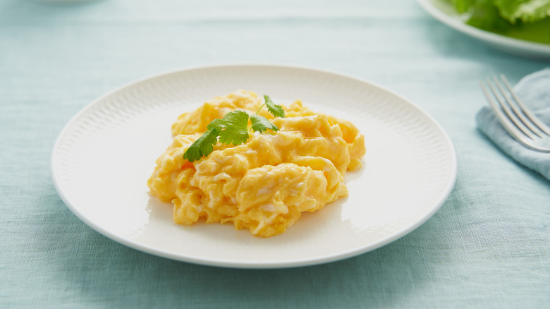 Martha Stewart enjoys scrambled eggs from time to time, but she makes them without a skillet — or a microwave. Instead, Stewart turns to the steam wand on her espresso machine. She calls the dish "scrambled eggs à la cappuccino machine." To make this recipe, she cracks eggs into a clear coffee cup with a bit of butter, salt, and pepper. Then, she uses the frothing feature on her machine to create fluffy scrambled eggs in a matter of minutes.