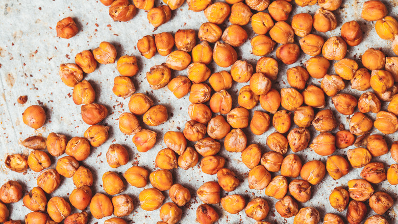 Whether you're adding a low-carb "crouton" to your salad or are desperately craving a crunchy salty snack, roasted chickpeas check many boxes: They have the ability to absorb just about any flavor presented to them, add textural contrast to dishes, are easy to prepare, and boast a nutritional profile. Whether you call them chickpeas or garbanzo beans, Harvard T.H. Chan says there really is no difference between the two, besides "chickpeas" deriving from Latin, and "garbanzo" deriving from Spanish. However, these unique legumes have some characteristics worth mentioning, seeing that some may add a few steps to your chickpea roasting.