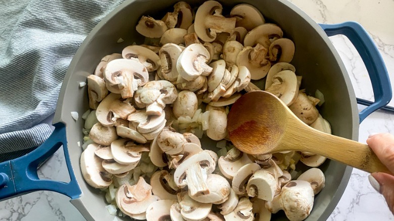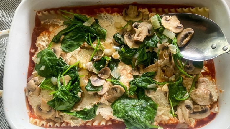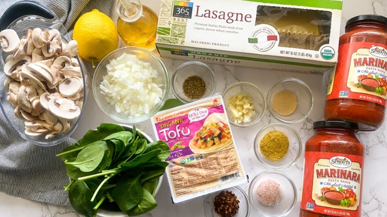 To make this recipe, we'll need some fresh produce items — onion, garlic, mushrooms, spinach, and lemon. You can grab some extra firm tofu while you are in the produce department. Hahn says, "Extra firm works best here but firm will work also if that's all you can find. You are looking for the type that is packed in water and not baked." Then we'll need some oil, nutritional yeast, garlic granules, oregano, salt, red pepper flakes, and marinara sauce. Hahn shares, "There are lots of vegan cheeses on the market, so feel free to pick up some mozzarella and Parmesan if you want to include them." You also might want some fresh basil to top your lasagna.