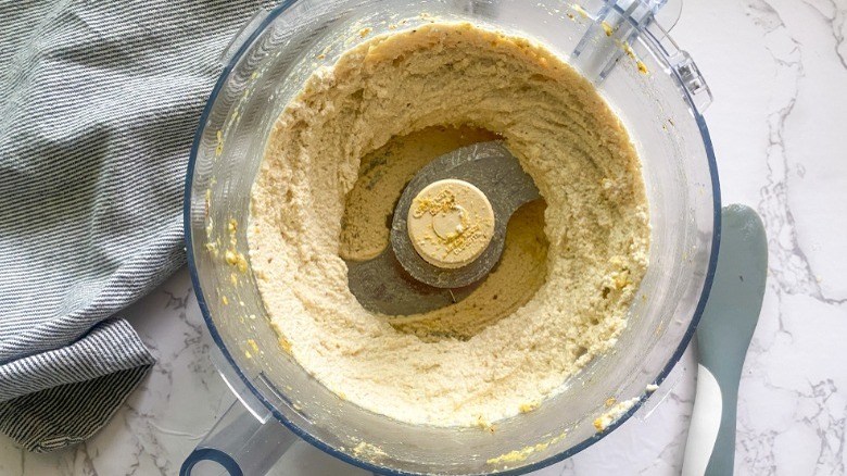 Once the tofu is ready, break it into smaller pieces and put it into a food processor with the nutritional yeast, lemon juice, garlic granules, oregano, salt, and 1 tablespoon of the oil. Blend until smooth and set aside.
