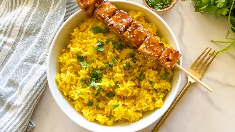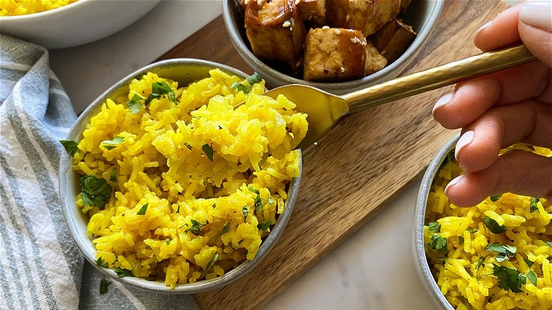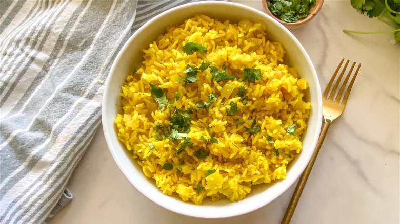 Wellness coach and recipe developer Miriam Hahn brings us this recipe for stovetop yellow rice and says, "This is one of my favorite rice recipes for a few reasons. The texture is fluffy and light, and the combination of ingredients gives the rice a fabulous flavor. I also love using turmeric in my cooking. It has a full array of health benefits, including acting as an anti-inflammatory, [lowering] the risk of heart disease, and [can help ease] arthritis pain" (via Healthline). The turmeric is also what gives the rice its deep yellow color. Read on to learn how to make this easy stovetop yellow rice.