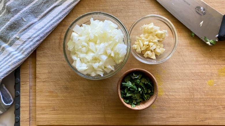 - Dice the onion, mince the garlic, and chop the cilantro. Add the oil to a medium pot, and heat to medium high.