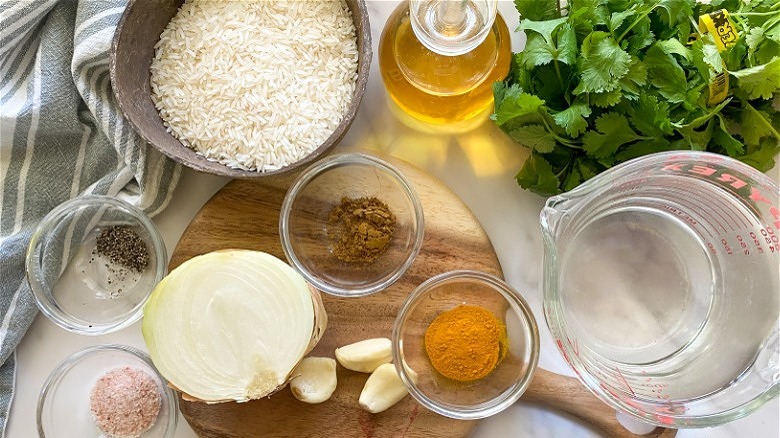To make this recipe, you just need a short list of ingredients, and many of them you may already have on hand. You'll need an onion, garlic, and cilantro, in terms of fresh produce. Hahn tells us if you don't have a yellow onion, any other type will work fine. We're going to choose a long grain rice for this recipe, like jasmine or basmati. The spices we need are cumin, turmeric, salt, and pepper, and then we'll need some olive oil and water. The turmeric is a key ingredient here, and gives us the color we want for yellow rice, so this is not a spice to leave out.