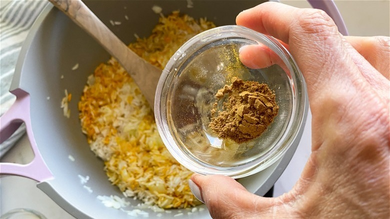 While the pan is nice and hot, add in the rice, along with the cumin, turmeric, salt, and pepper. Stir for a couple of minutes to blend the spices, and toast the rice. "Toasting the rice, and blending it with the spices before adding the water is a nice trick to make your rice more flavorful," Hahn shares.