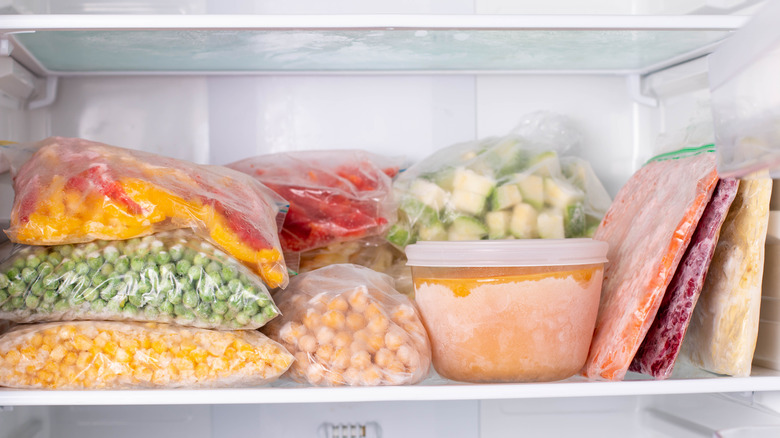 There are quite a few foods you're likely storing in the freezer that you shouldn't. For starters, anything containing cornstarch, typically used as a gluten-free thickener in soups, stews, and sauces, thaws from its frozen state horribly. Use flour, agar agar, or arrowroot instead, or wait to add the thickener until after the dish has been defrosted. In addition, leftover egg whites can become tough and rubbery, and dairy products like milk, yogurt, and cheese are likely to separate. Potatoes are another unlikely leftover that has a difficult time with thawing. They become mealy unless they've been flash-frozen. Lastly, we recommend avoiding freezing your raw vegetables until you plan to blend them up in a sauce or don't mind a mushy texture. Veggies are mostly water; once their structure breaks down during the thawing process, they can become limp. Try blanching vegetables before freezing them to help them keep their form.