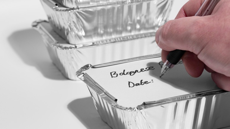 Each container or baggie should be labeled with the item's name, the date it was made, the date it was frozen, and any top allergens like nuts, eggs, or gluten. While that last label may seem like overkill, it can save you from dangerous speculation down the road when your dinner guest declares their allergy or your kid makes a new friend, and they raid the freezer. By labeling each dish with the date, you can be secure in knowing that you're in the safe zone and that your leftovers have not spoiled before you risk your stomach or those of your family. Write your labels on the top and the side of the Tupperware to avoid rearranging and removing unnecessary items from the freezer just to check what it is.