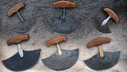 Since early Inuit communities lacked the technology to smelt metal, ulu knives were historically made from slate. However, meteorites and naturally-occurring deposits provided iron and copper for ulu knives, too. Archeological evidence shows that these metal knives traveled across the arctic through trade routes.