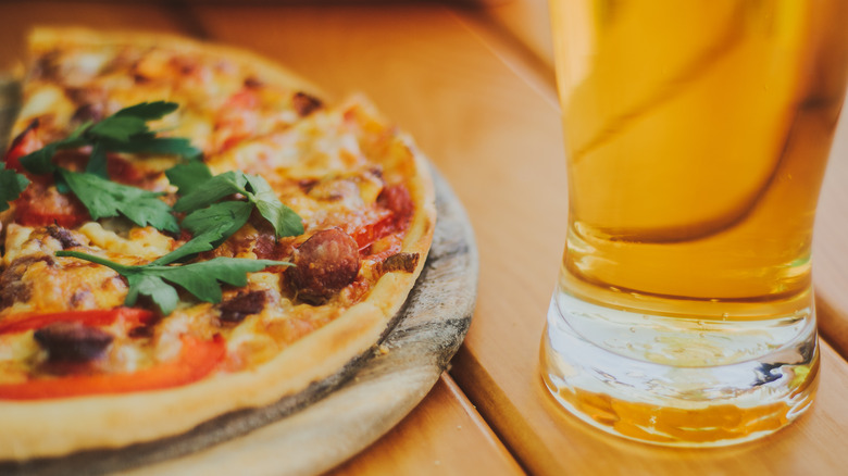 Stephanie Rapone's recipe calls for adding beer to a mixing bowl with flour, baking powder, and salt. Work the dough until it starts to pull away from your mixing bowl, adding a bit of flour if the dough is too wet. Then, you should proceed as you would with any other pizza dough recipe. The only other difference is letting the dough rise for just a couple of hours. Because you've added plenty of carbonation and alcohol, there is no need to wait for the beer yeast in your dough to add much more. According to Rapone, "The beer is the special ingredient here, providing rise and a bit of that 'yeasty' flavor without yeast." Pro tip: Open a 16-ounce beer for the recipe and you'll have 4 ounces. left over for yourself.