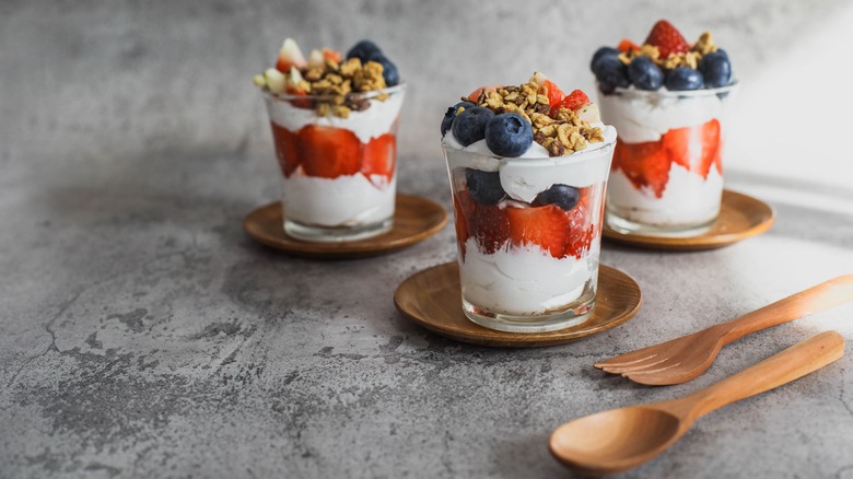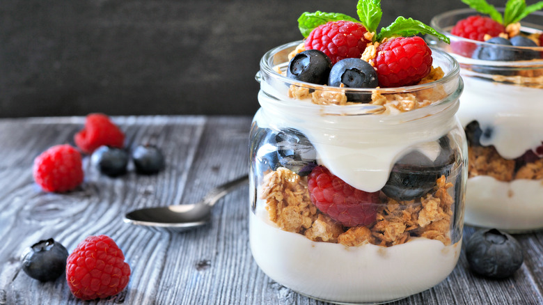 While there are many different variations of a classic yogurt parfait, the original dish is simply yogurt in a jar layered with granola and berries, according to The Recipe Critic. It's usually finished with some berries on top and often a bit of honey.