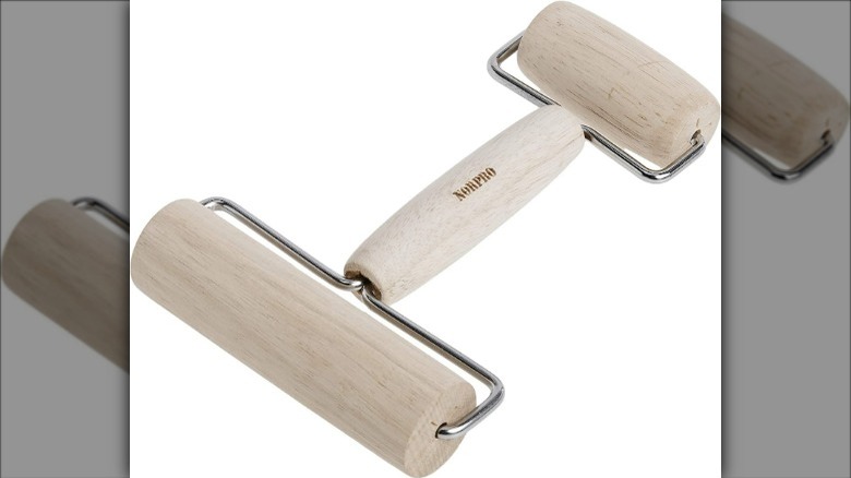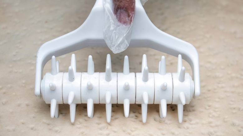 To ensure an even baking crust, you'll need to make sure your pizza dough is evenly rolled out. While you can stretch your pizza dough by hand (which includes tossing like a pizza pro), you can also make your life easier by purchasing a pizza roller. Most of these hand-held rollers are built of several different kinds of dough including pizza dough, pie dough, and pastry. The pizza roller is also lighter than a rolling pin — the latter of which you should never use to roll out pizza dough.
