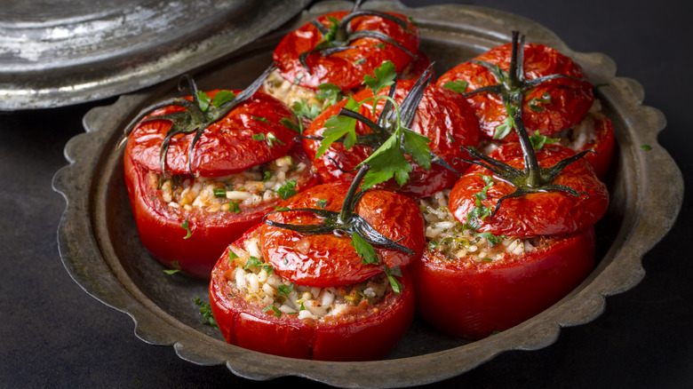 If you love stuffed, baked tomatoes and are looking to prepare some in an Italian, Greek, or Turkish style, the first thing you'll want to pick out, most likely, are the tomatoes themselves. While all types of tomatoes — from grape to cherry to plum to heirloom — boast their own type of deliciousness, when it comes to stuffed tomatoes, you'll want to select fruits that are large, sturdy, and not too watery.