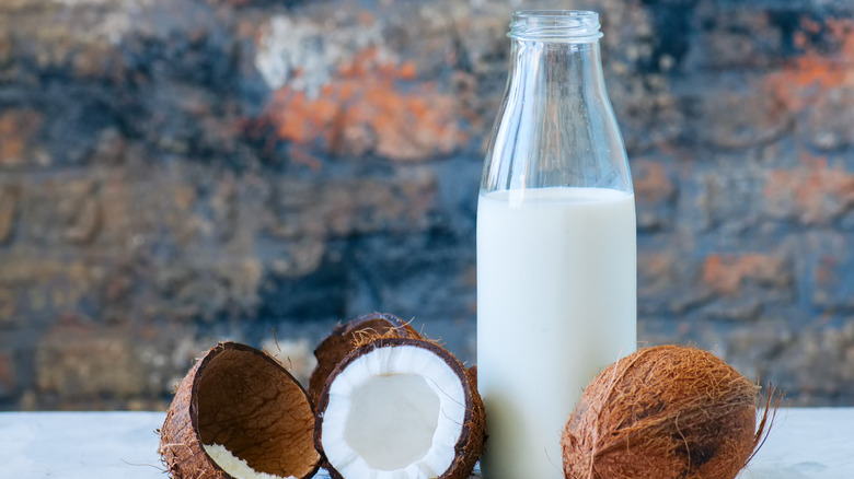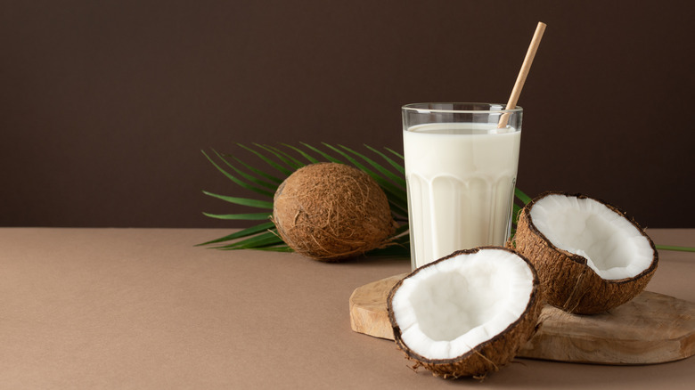 To make the milk, MasterClass suggests mixing shredded coconut and hot water in a ratio of eight ounces of coconut to four cups of hot water. After the mixture has cooled to room temperature, use a food processor or blender to break down the coconut flesh, then pour the pulpy mass into a nut bag or cheesecloth over a strainer and massage until you've extracted as much of the liquid as possible. The leftover meal can either be discarded, or dried and used as coconut flour. Coconut milk can then be seasoned with salt to taste.