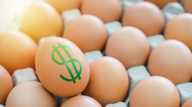 We've heard a lot about the dramatic increase in egg prices over the last year, and for good reason. Eggs are a staple in many households in the U.S.; according to Statista, the predicted per-capita consumption for 2022 was 288 eggs per person, meaning that, on average, people eat eggs more days than they don't. Increases in egg prices are worse in some parts of the country than others since some states like California and Colorado passed legislation requiring larger enclosures and more room for egg-laying hens — measures that inevitably increase prices.