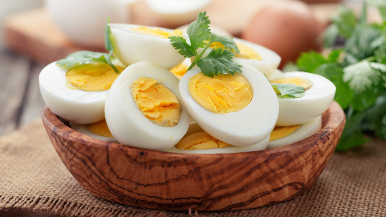 A hard-boiled egg is one of the most useful foods to have in your refrigerator. They're great for snacking, putting on salads, or for a quick, easy meal any time of the day. According to WebMD, a hard-boiled egg is full of protein and high in vitamin D, which means you gain muscle-building nutrients that are also great for your bones when you eat them. Talk about appealing.