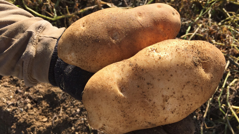 Simply Recipes says russets are larger than other potato varieties, meaning they'll hold more and offer heartier portions for the small army you feed at home. Russet potatoes contain more starch compared to other varieties, notes Foodie With Family, which allows for more consistent cooking times without burning, scorching, or overly drying your loaded potato skins. Need a scientific reason? Potato Grower notes that Russet Burbank varieties of potatoes set their skin very quickly, allowing them to develop more thickness before harvesting compared to other types. Once harvested, potatoes develop even thicker skins after storage, says Idaho Potatoes.
