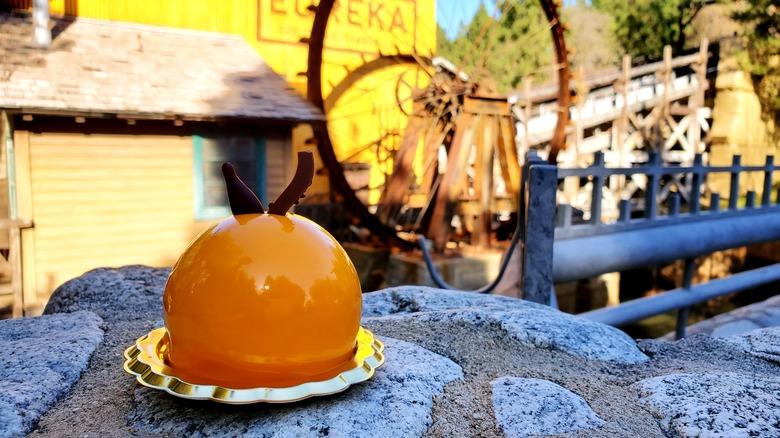 Several foods are usually served for the Lunar New Year: dumplings, noodles, and tangerines or oranges (all of which can be found throughout the marketplace). The round citrus is a common offering during this festive time of year because eating and adding them to centerpieces is thought to bring good fortune and luck. Because of the orange's symbolism, it makes sense that the pastry chefs at Disneyland decided to add this stunning Mandarin Mousse Cake to the marketplace.