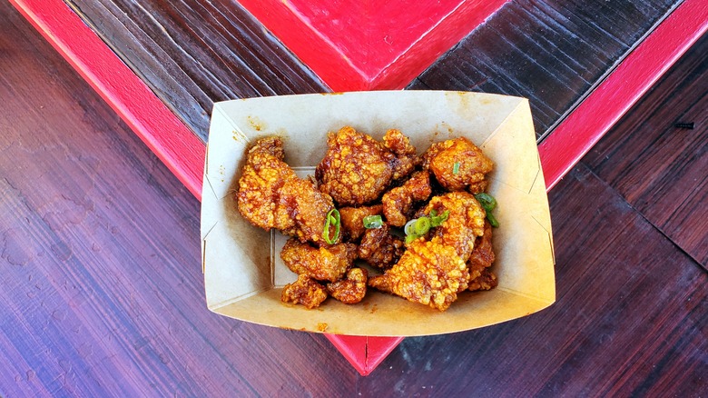 Who doesn't love fried chicken? We certainly do. Moist chicken covered in a crispy shell? It may be the best food on earth. But, it's even better when it's bite-sized, which is exactly what the chefs did this year for the Disney California Adventure Lunar New Year Festival. Found at the Red Dragon Spice Traders, this dish is sweet, savory, and spicy all at the same time. Actually, if you're a fan of all things spicy, look no further than Red Dragon because both of its offerings are high on the Scoville scale.