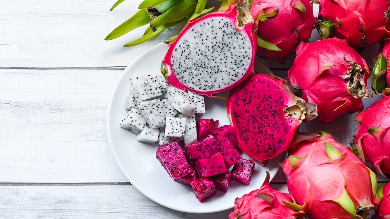 Also known as pitahaya, dragon fruit tends to be round with flared, magenta skin that hides a pearly white flesh that's speckled with black seeds. However, Livestrong notes that some varieties might have red or yellow skin, while others boast crimson or purple-tinted flesh. Regardless of its appearance, dragon fruit often has a subtly sweet, yet tart flavor that's reminiscent of both pears and kiwis. As for how to reach the fresh and juicy interior of dragon fruit, Better Homes & Gardens suggests slicing the fruit in half and then scooping out the flesh with a spoon or melon baller.