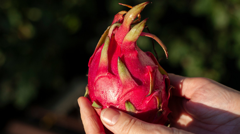 Aesthetics play the biggest role by far when shopping for the pink-hued produce. Aside from displaying a vibrant magenta hue and crisp green tips, Unpeeled states that the exterior of the dragon fruit should also be totally void of wrinkles and blemishes. Instead, dragon fruits should be shiny and smooth. Additionally, McCormick shares that ripe dragon fruit should also feel firm with some slight give when squeezed, much like an avocado. If the fruit is too squishy, then pass.
