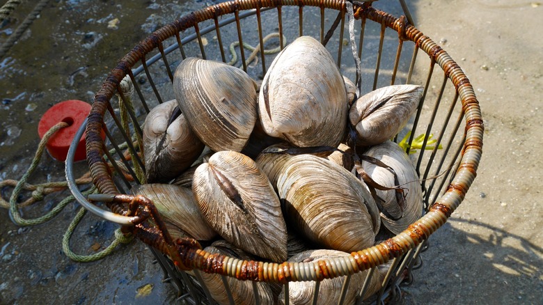 To make a filling, comforting, knock-out clam pie, nothing but northern quahogs will do. Quahog (pronounced KOE-hog) clams are the clams you're likely to find in your po' boys and chowders (per The Kitchn). Quahogs are colloquially also called "chowder clams." Why? They're massive. According to Cape Cod Shellfish & Seafood Co., Inc., they're the largest clam variety with an average width of 3 ½ inches. For comparison, Cherrystone and Top Neck clams are typically around 2 ½ inches wide. Quahog clams weigh ⅓ to ½ pounds each, explains The Kitchn; impressive heft for a single clam. Quahogs are also commonly found in the waters surrounding Connecticut, Rhode Island, Maine, and Canada, making them a fitting ingredient for this regional dish.
